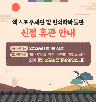 엑스포주제관 및 한의학박물관 신정 휴관 안내  휴관일 : 2026년 1월 1일 신정 휴관장소 : 엑스포주제관 및 산청한의학박물관 외에 동의보감촌은 정상영업합니다.